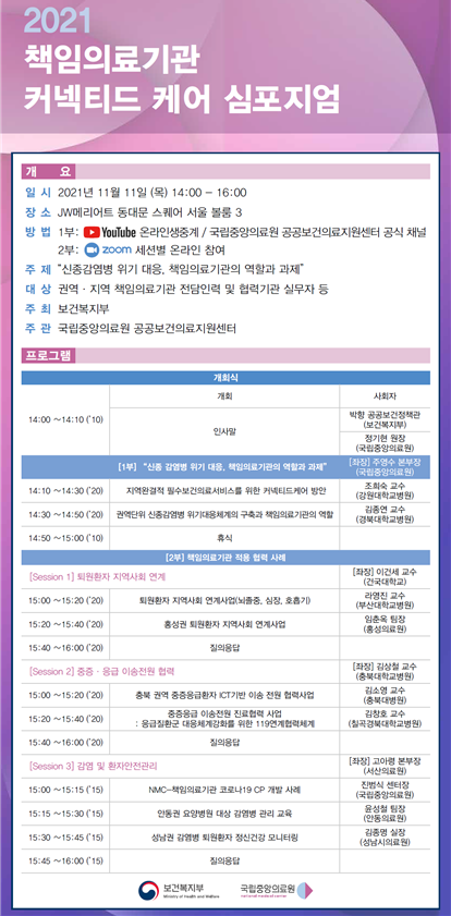 국립중앙의료원 정기현 원장은 “단계적 일상 회복 이후 앞으로 책임의료기관이 나아갈 방향에 대한 건설적인 논의를 기대한다”고 밝혔다.