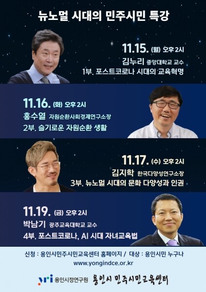 오는 15일부터 19일까지 4회차에 걸쳐 화상회의 앱인 줌으로 운영하는 특강은 시민들이 포스트 코로나 시대를 앞두고 빠르게 변하는 패러다임에 미리 대비할 수 있도록 용인시민주시민교육센터가 마련했다.