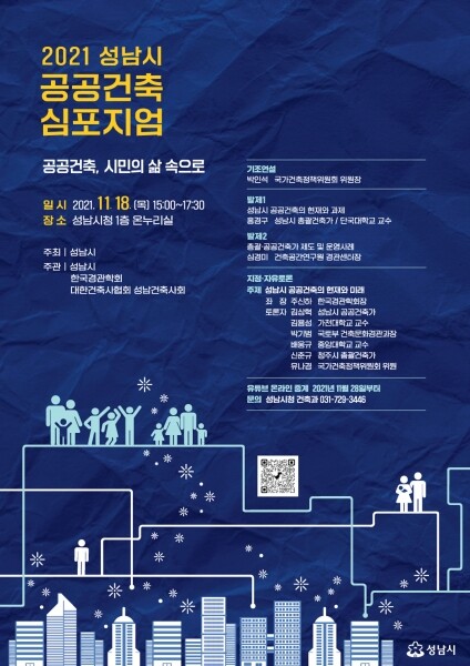 심포지엄 1부는 박인석 대통령소속 국가건축정책위원회 위원장이 기조연설을 하고 홍경구 성남시 총괄건축가가 ‘성남시 공공건축의 현재와 과제’를, 심경미 건축공간연구원 경관센터장이 ‘총괄·공공건축가 제도 운용 사례’를 각각 발표한다.