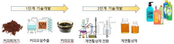 이번 평가에서 높은 점수를 받은 ‘글로벌 팜오일 규제에 대응하는 커피오일 메틸에테르설폰산염 개발’ 과제는 매년 1천만 톤에 달하는 커피찌꺼기를 통해 팜오일과 유사한 성분의 커피오일을 추출하고[1단계],올해부터 이를 활용해 친환경 바이오 계면활성제 개발을[2단계] 목표로 기술개발을 본격 추진한다.