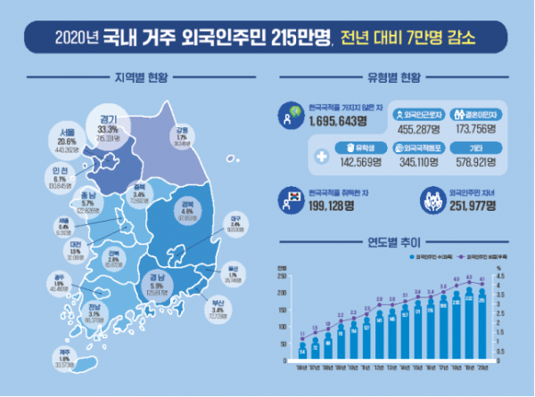 행정안전부는 통계청의 인구주택총조사 자료를 활용해 ‘2020 지방자치단체 외국인주민 현황’을 발표하고 우리나라에 거주하는 외국인주민은 모두 214만 6,748명인 것으로 조사됐다고 밝혔다.