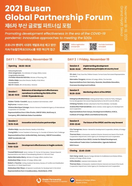 2011년 개최된 ‘부산세계개발원조총회’의 공약이행 점검과 다양한 개발주체가 참여하는 포용적인 협의체인 ‘효과적인 개발협력을 위한 글로벌 파트너십’의 활성화를 위해 2014년 이후 동 포럼 개최 중 이번 포럼은 ‘코로나19 시대의 개발효과성 제고방안 : 지속가능발전목표를 위한 혁신적 접근’을 주제로 개최되며 국제기구, 공여국 및 수원국 정부, 시민사회, 기업, 재단, 학계 등 다양한 분야의 인사 100여명이 참석할 예정이다.