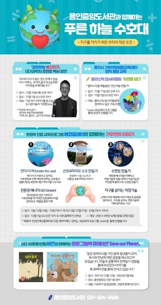 아울러 용인중앙도서관 1층 로비에서 환경그림책을 소개하는 청년 북큐레이션팀 ‘버즈’의 전시 ‘Save our Planet’도 볼 수 있다.