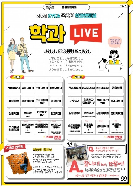 행사에 참여한 이예림 학생은 “이번 행사를 통해 진학하고자 하는 학과에 대한 내용들을 선배들에게 직접 듣게 되어 도움이 됐고 무엇보다 복수전공을 하고 있는 선배들의 조언을 들을 수 있어 진로방향을 결정하는데 큰 도움이 됐다”며 “코로나19로 많은 활동이 어려운 상황에서도 이렇게 좋은 기회를 마련해주신 선생님들께 너무 감사하다”라는 말을 전했다.