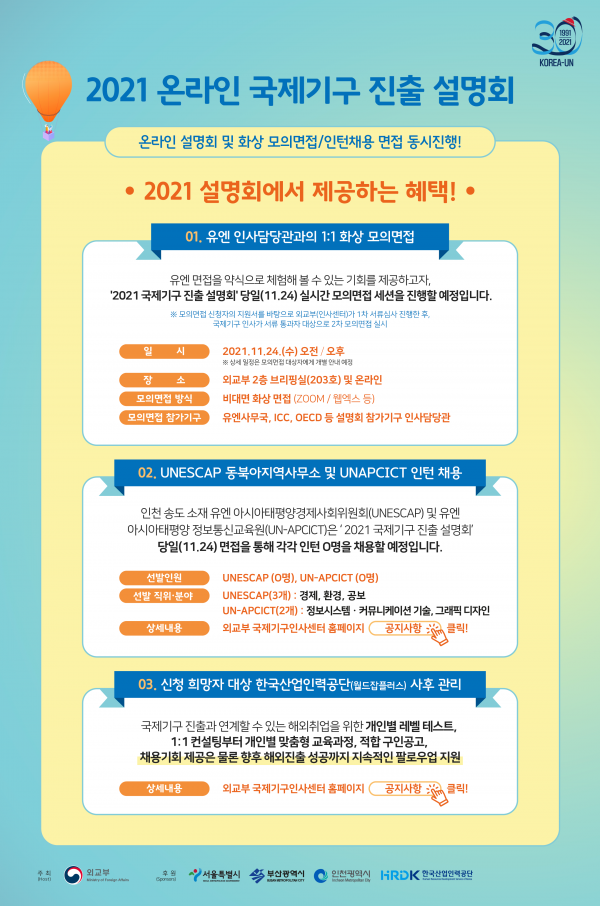 특히 금번 설명회 참석 신청자 중 희망자 대상으로 참석 국제기구 인사담당관과의 실시간 화상 모의 면접 기회를 제공하고 국제기구 진출과 연계할 수 있는 해외취업 기회를 한국산업인력공단과 협업을 통해 지원해 나갈 계획 외교부는 앞으로도 국제기구 진출 설명회를 포함해 보다 많은 유능한 인재들이 유엔을 포함한 국제무대에서 역량을 한껏 발휘할 수 있도록 다양한 노력을 통해 지원해 나갈 예정이다.