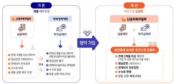이를 통해, 학자금대출과 금융권대출을 연체한 채무자는 신용회복위원회를 통해 통합 채무조정이 가능해지는 한편 기존에 비해 더욱 강화된 채무조정 지원을 받을 수 있을 것으로 기대된다.