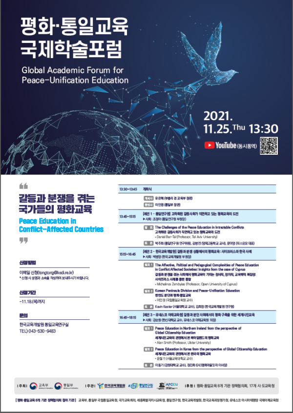 ‘갈등과 분쟁을 겪는 국가들의 평화 교육’을 주제로 열리는 이번 포럼은 국내와 이스라엘, 사이프러스, 북아일랜드 등 해외의 평화학자들이 참여해, 각국의 갈등 극복과 평화 교육의 경험을 공유하고 한반도와 세계의 평화 교육 방향을 함께 논의할 예정이다.
