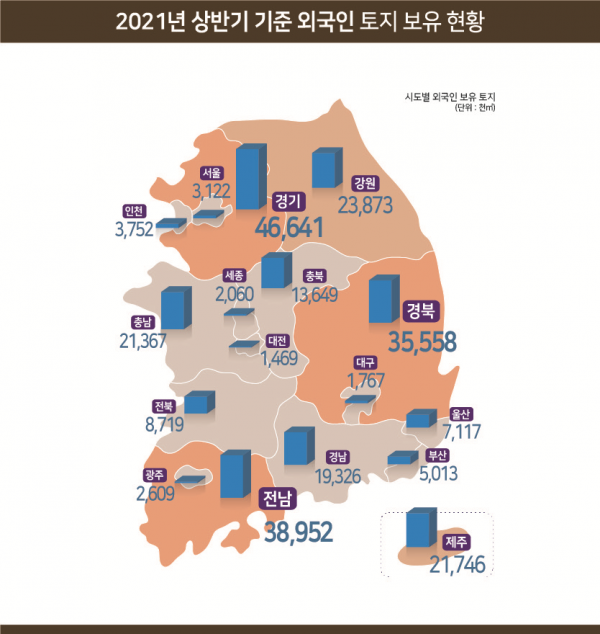 경기도가 4,664만㎡로 외국인이 가장 많은 토지를 보유하고 있는 지역이며 전남 3,895만㎡, 경북 3,556만㎡, 강원 2,387만㎡제주 2,175만㎡ 순으로 보유면적이 큰 것으로 나타났다.
