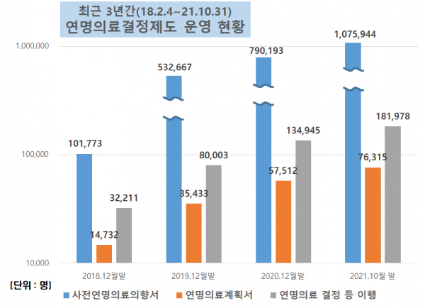 연명의료결정법을 시행한 지 3년 6개월째인 2021년 8월, 100만명이 넘는 숫자가 사전연명의료의향서를 작성했으며 현재 사전연명의료의향서 작성자 수는 107만 5,944명이다.