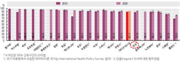 2020년 의료서비스 경험 조사를 통해 우리나라 외래 진료 환자의 경험을 OECD 회원국과 비교했다.