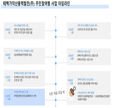 태백가덕산풍력발전은 국내 최초 지자체 주도 주민참여형 풍력사업을 통해 사업비의 일부를 태백시민펀드로 조성하고 이익 공유를 통해 지역주민 수용성을 높이고 탄소중립 공헌 및 직간접적으로 지역경제 활성화에 기여했다.