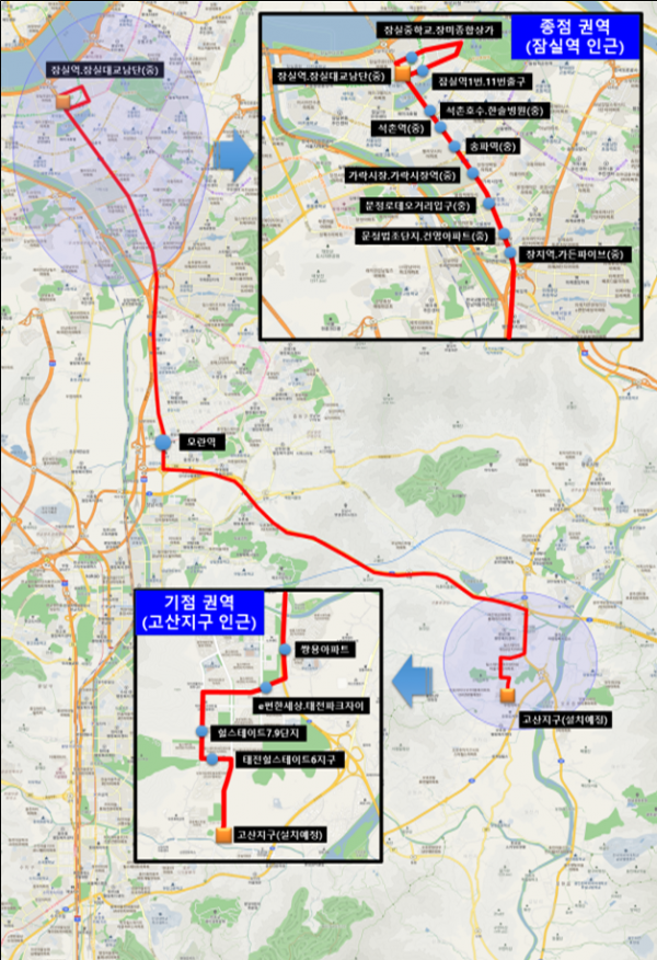 ? 고산·태전지구에서 서울 동부권으로 가기 위해서 수차례 환승해야하는 불편을 해소하고자 고산지구에서 태전지구를 거쳐 잠실역으로 운행하는 직행좌석형 노선을 신설한다.