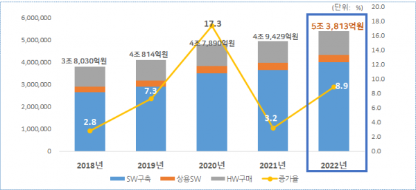 공공부문의 2,235개 기관 조사 조사결과 종합 2022년 공공부문 SW·ICT장비 총 사업금액 예정치는 5조 3,813억원으로 조사됐다.