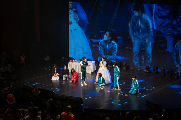 멤버들은 ‘오징어게임’의 트레이드마크인 초록색 추리닝으로 갈아입고 팬들과 ‘무궁화 꽃이 피었습니다’, ‘딱지 치기’, ‘달고나 뽑기’ 대결을 펼쳤다.