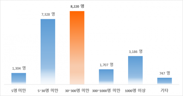 종사자 규모별 취업자 비중을 분석한 결과, 5명 미만 1,304명, 5~30명 미만 7,328명, 30~300명 미만 8,220명, 300~1000명 미만 1,707명, 1,000명 이상 3,186명으로 사업장 종사자 수가 30~300명 미만 기업의 비중이 가장 높았다.