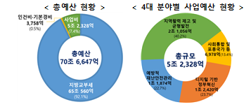 내년도 예산은 자치단체의 핵심 자주재원인 지방교부세 65조 560억원, 사업비 5조 2,328억원, 기본경비·인건비 3,758억원으로 구성된다.