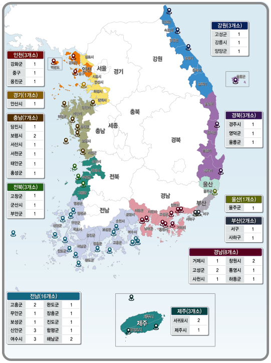 지역별로는 전남 16개소, 경남 8개소, 충남 7개소, 경북 3개소, 강원 3개소, 전북 3개소, 제주 3개소, 인천 3개소, 부산 2개소, 경기 1개소, 울산 1개소가 선정됐다.