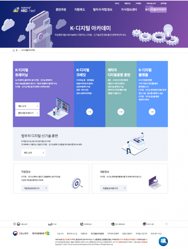 신설된 ‘K-디지털 아카데미’에서는디지털·신기술 분야 직업훈련 소개와 훈련과정 검색·신청,디지털·신기술 분야 직업과 산업 전망 소개,디지털·신기술 분야 채용정보 안내 서비스 등이 제공된다.