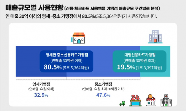 신용·체크카드로 지급된 국민지원금 사용액을 가맹점 매출규모 구간별로 분석한 결과, 연 매출액이 30억 이하인 영세·중소 가맹점에서 80.5%가 사용된 것으로 나타났다.