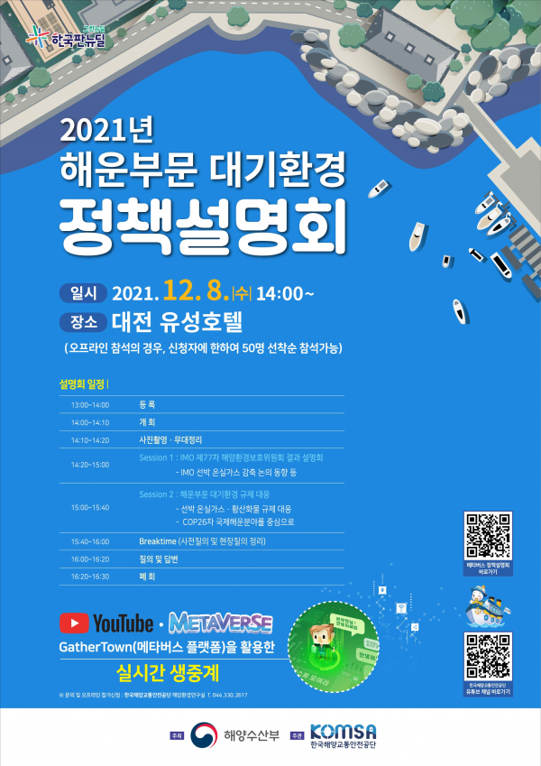 이번 정책설명회는 지난 11월에 열린 국제해사기구의 제77차 해양환경보호위원회에서 논의된 국제 해운의 2050년 온실가스 감축목표 이행계획과 내년부터 강화되는 선박 황산화물 배출규제 등에 관한 정보를 관련 업·단체와 공유하고 이에 대한 대비를 당부하기 위해 열린다.