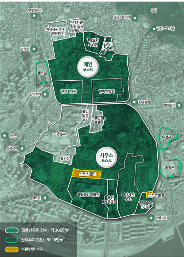 국립중앙박물관 북측에 인접해 위치하고 있어 도보로 접근이 가능한 약 4.5만m2 정도의 부지이며 기존 미군들이 체육활동을 하던 공간으로 축구장·야구장은 인조잔디 보수·안전울타리 설치 등 보완공사를 거쳐 기존 용도대로 사용하고 공원 및 골프연습장으로 사용하던 나머지 공간은 산책로로 조성된다.