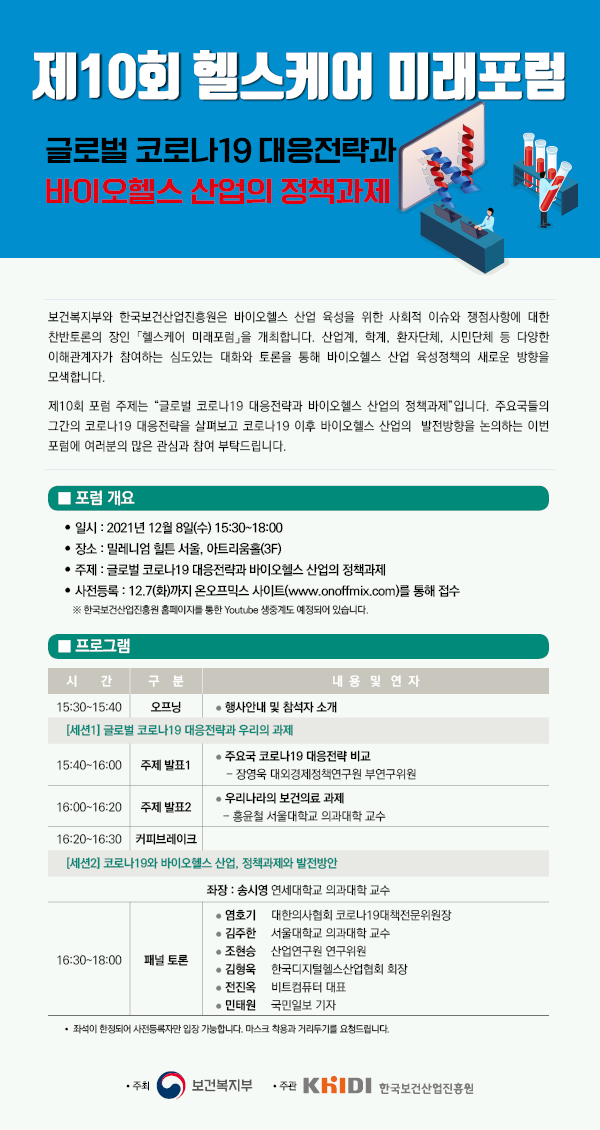 이번 제10회 토론회는 포스트 코로나 시대 국민들의 일상회복을 위한 바이오헬스 산업의 여러 과제와 발전방안을 논의하기 위해 마련됐다.