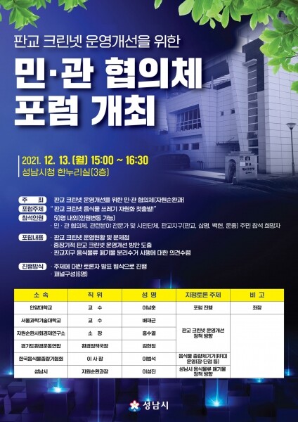 ‘판교 크린넷 운영개선 정책 방향’에 대해 배재근 서울과학기술대학교 교수와 홍수열 자원순환사회경제연구소장, 김현정 경기환경운동연합 환경정책국장 등 3명이 주제 발표를 한다.