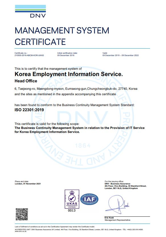 한국고용정보원은 2021년 12월 국제 경영시스템 인증기관인 DNV에서 심사한 ‘비즈니스 연속성 경영시스템’의 국제 표준규격인 ISO 22301:2019 버전의 전환심사를 통과했다고 밝혔다.