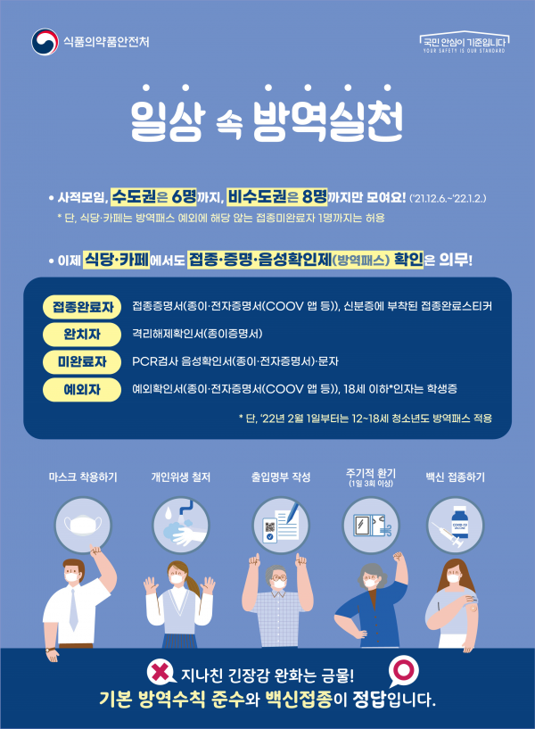 식약처는 지방자치단체와 함께 12월 31일까지 모임과 행사가 많은 음식점과 유흥시설 등을 중심으로 방역패스 준수 여부 등을 집중 점검할 계획이라고 전했다.