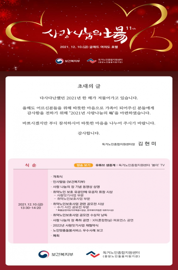 또한, 사랑 나눔의 장 기념 동영상 상영, 축하 공연, 수기 공모 당선작 낭독 등의 다채로운 행사가 진행되어 취약노인에 대한 사회적 관심을 모으는 계기가 됐다.