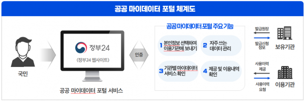 마이데이터는 국가나 기업이 보유하고 있는 정보 주체인 개인의 정보를 말하며 공공 마이데이터 서비스란 공공·행정기관이 보유하고 있는 개인의 행정정보를 본인 또는 본인이 지정한 제3자에게 제공할 것을 요구할 수 있는 제도를 의미한다.