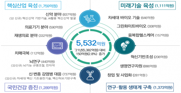 ’22년 바이오 원천기술 개발을 위한 투자규모는 ’21년 5,382억원 대비 150억원이 증가한 5,532억원 규모이며 핵심산업 분야 집중 지원, 선제적 미래전략기술 확보 및 연구·활용 생태계 조성, 국민건강 증진 연구개발 확대 등 3대 분야를 중심으로 중점 추진할 계획이라고 전했다 국산 혁신신약 개발을 위한 전주기 지원과 신약개발 효율화를 위해 총 837억원을 지원한다.