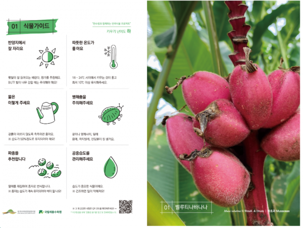 원예가이드 및 반려식물 관리카드에는 물주기·온도·병해충 관련 정보가 수록되어 있으며 엽서 형태의 디자인으로 제작되어 수목원 방문 기념품으로 활용할 수 있다.