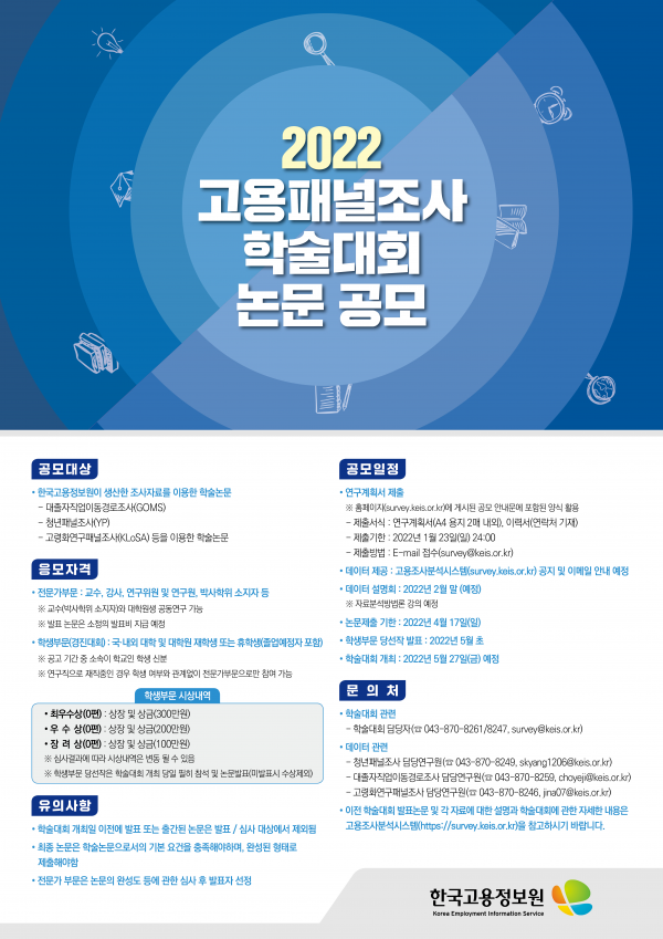 선정된 논문은 2022년 5월 27일 개최 예정인 ‘2022 고용패널조사 학술대회’에서 발표되며 학생부문 당선자에게는 상장과 상금을 수여하고 전문가부문 연구자에게는 소정의 원고료를 지급한다.