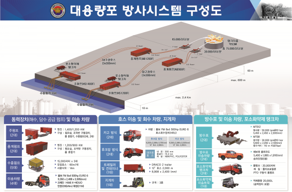 ‘대용량포 방사시스템’은 방수포·주펌프·중계펌프·수중펌프·트레일러·지게차·포소화약제 탱크차 등 총 17대의 장비로 구성되는데, 대형펌프차 26대가 동시에 방수하는 수준인 분당 7.5만ℓ의 소방용수를 최대 130m까지 방수할 수 있는 능력을 갖췄으며 수중펌프를 활용하면 호수·하천·해수를 소방용수로 무제한 이용할 수 있다.