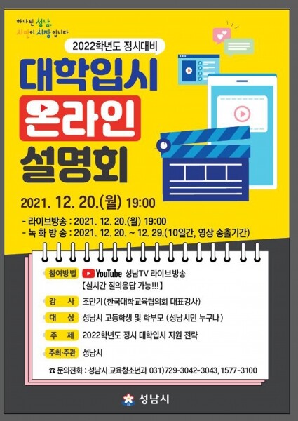 이날부터 오는 12월 29일까지 성남시 공식 유튜브 채널인 ‘성남TV’를 통해 입시설명회를 시청할 수 있다.
