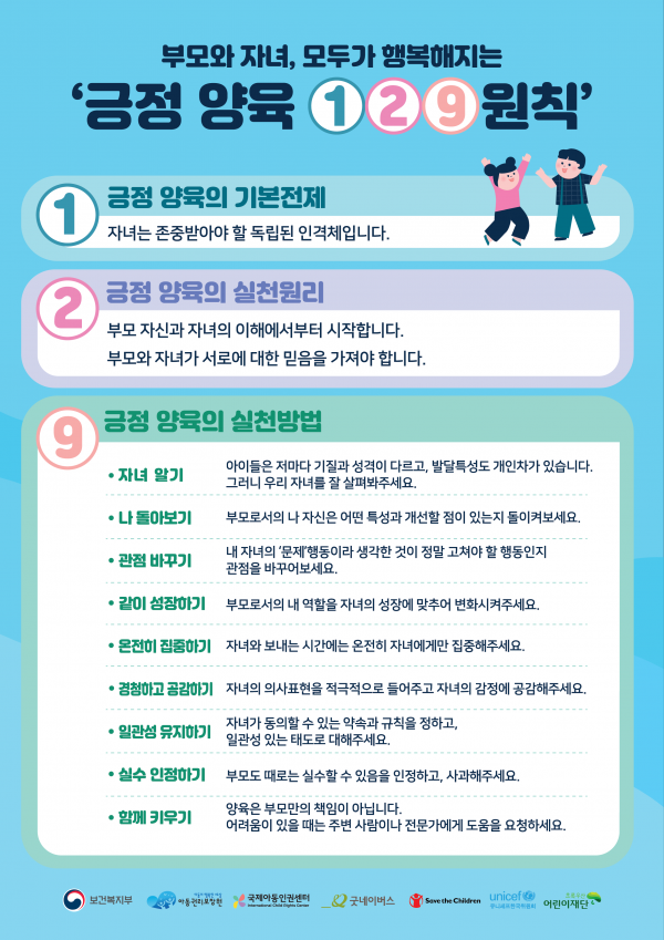 이번 행사는 예방교육 및 공익광고 영상 상영을 시작으로 긍정 양육 토크쇼를 진행한 후 긍정 양육 129원칙을 소개했으며 참가자에게 긍정 양육 원칙을 담은 홍보물을 전달했다.