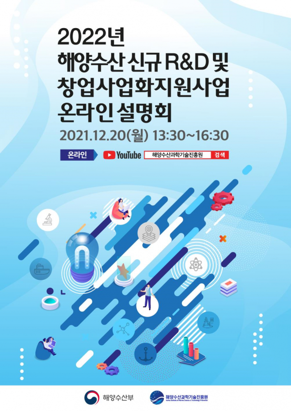 2022년 신규 추진되는 해양수산 R&D 37개 사업의 과제별 사업설명서와 연구 참여 절차, 사업별 담당자 등을 소개하고 내년에 진행되는 해양수산 기술거래 및 사업화 지원 사업, 창업투자 지원 사업, 기술 인증 및 평가 제도 등 23개 사업의 내용 및 참여 조건, 공모 방법 등을 설명할 예정이다.