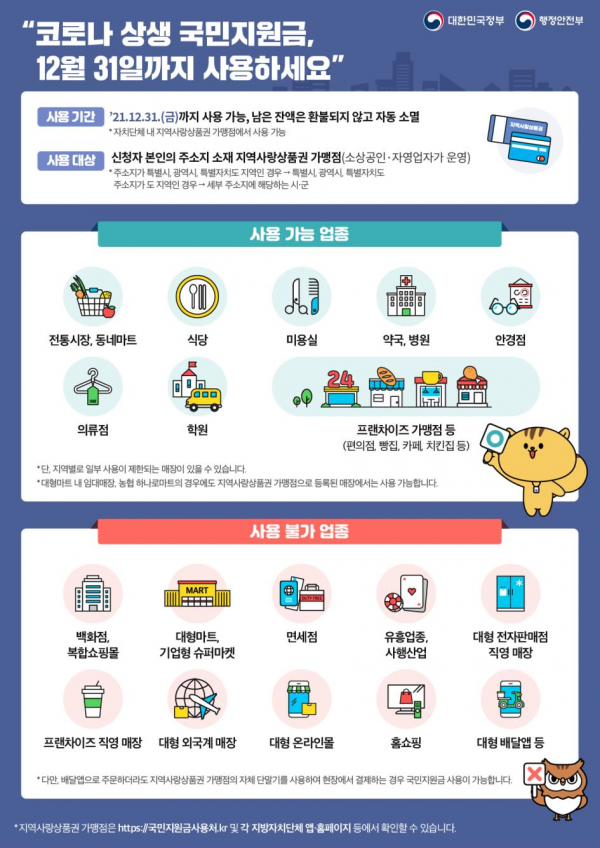 정부는 국민지원금이 신속하게 사용되어 코로나19로 인한 지역경제 피해 회복에 기여할 수 있도록 사용기간을 12월 31일까지로 설정했으며 사용되지 않은 잔액은 국가와 자치단체로 환수될 예정이다.