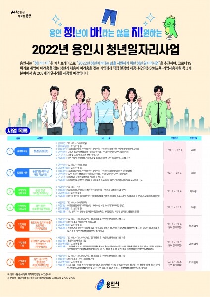 용인청년 일자리창출 프로젝트1은 관내 사회적기업·협동조합을 대상으로 프로젝트2는 용인상공회의소를 통해 선정된 관내 소재 중소기업을 대상으로 진행된다.