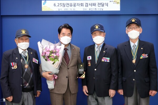 백 시장은 이날 용인시청 시장실에서 6·25참전유공자의 복지증진을 위한 꾸준한 지원과 보훈명예수당 인상을 위해 조례를 개정하는 등 유공자 및 유족의 권익향상과 보훈 문화 발전에 이바지한 공로로 6·25참전유공자회 용인시지회가 수여하는 감사패를 받았다.