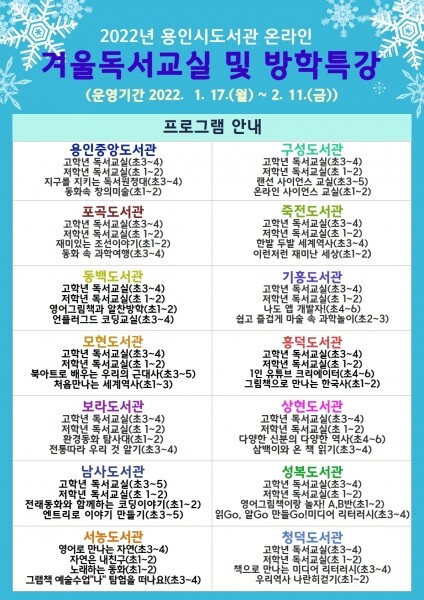시 도서관사업소 관계자는 “코로나19로 인해 많은 시간을 집에서 보내야 하는 아이들을 위해 준비했다”며 “이번 프로그램을 통해 책과 친해질 수 있는 유익한 겨울방학이 되길 바란다”고 말했다.