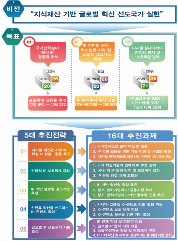 이번 기본계획은 디지털 대전환, 기술패권경쟁, 코로나 팬데믹 등 급변하는 글로벌 환경 변화에 선제적으로 대응하기 위해 ‘지식재산 기반 글로벌 혁신 선도국가 실현’을 비전으로 3대 정책목표, 5대 전략, 16개 중점과제를 추진하게 된다.
