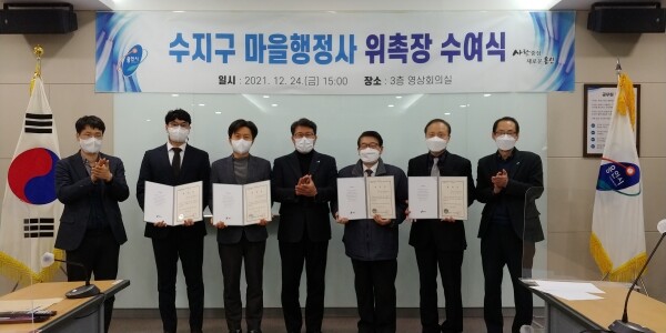 수지구는 24일 마을행정사 위촉식을 열고 백정우 행정사, 정상훈 행정사, 성낙정 행정사, 추지호 행정사 등 4명에게 위촉장을 전달했다.