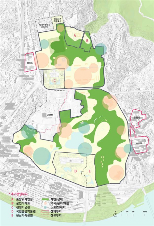 옛 방위사업청, 군인아파트, 전쟁기념관 등 용산공원조성지구로 신규 편입된 부지들에 대한 기본구상을 마련했다.