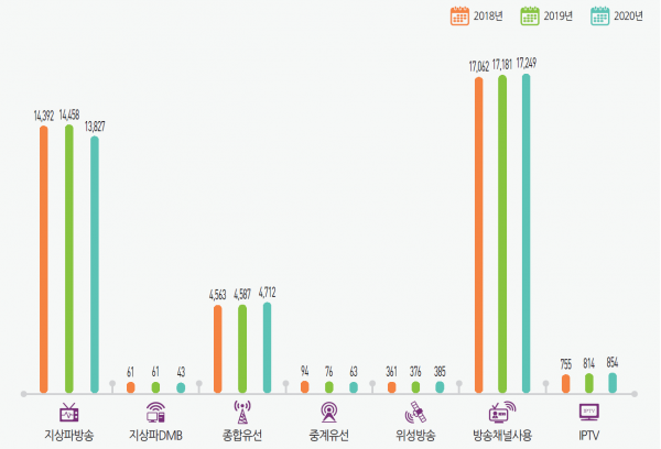 사업자 유형별 가입자 수는 IPTV 1,854만 단자, SO 1,313만 단자, 위성방송 308만 단자, RO 3.6만 단자이다.