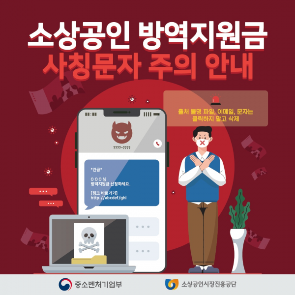 한편 최근 정부나 공공기관을 사칭해 방역지원금 등 소상공인 지원사업을 신청하라는 문자가 무작위로 발송되고 있다.