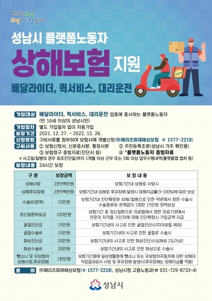 성남시 고용노동과 관계자는 “스마트폰 앱 등 플랫폼을 통해 노무를 제공하고 수수료를 받는 플랫폼노동자들의 특성상 산재보험 가입이 어려워 상해보험 가입을 지원하게 됐다”며 “성남시는 7월부터 지원 중인 산재보험료와 유급병가에 이어 이번 상해보험 지원까지 3종 사업을 추진해 노동 취약계층의 사회안전망을 구축하고 있다”고 말했다.