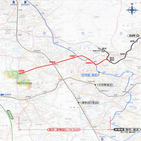 신분당선은 현재 강남∼광교 구간이 운행 중이며 이번에 기본계획을 고시하는 ‘광교∼호매실 연장 사업’을 통해 광교중앙역에서 수원 호매실까지 10.1km 구간이 신설·연장된다.