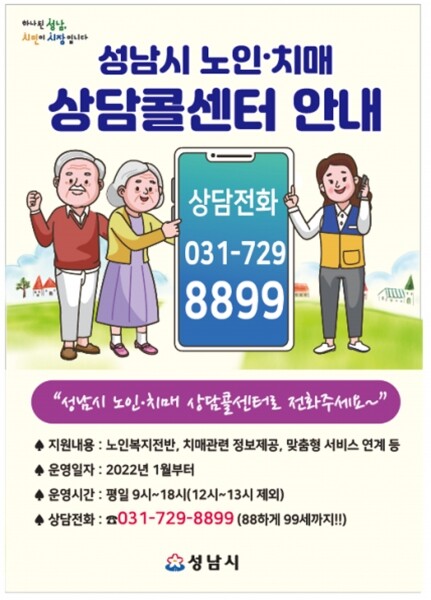 상담콜센터가 속한 시청 노인치매팀은 성남지역 의료·복지·돌봄·문화·안전·보호 분야 9개 기관·단체와 함께 돌봄서비스를 추진한다.